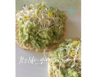 Voor dit recept kies ik voor gemak en ga ik voor Guacamole op een linzenwafel met gemengde kiemen